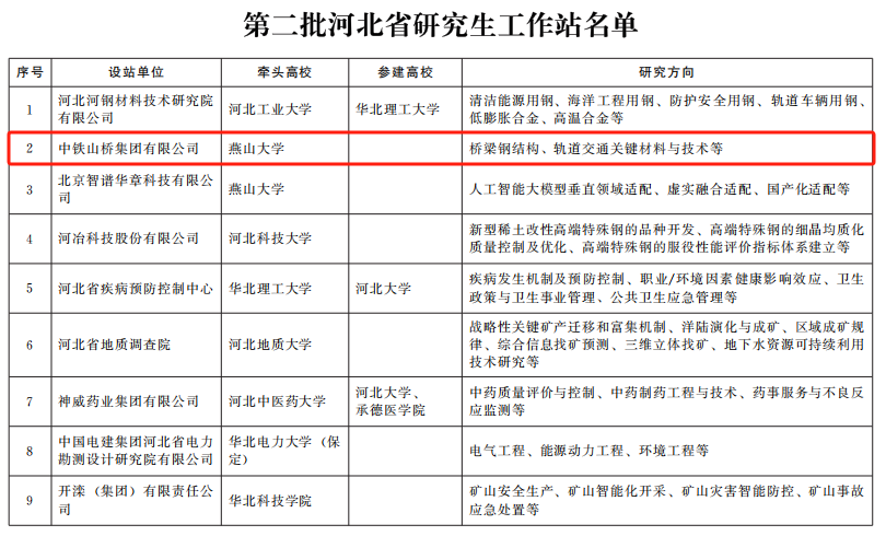 12月4日,河北省教育廳公布了第二批河北省研究生工作站評(píng)選結(jié)果,中鐵山橋與燕山大學(xué)共建的研究生工作站榜上有名,標(biāo)志中鐵山橋在“六新”人才培養(yǎng)與科技創(chuàng)新協(xié)同發(fā)展工作領(lǐng)域邁出堅(jiān)實(shí)步伐。
